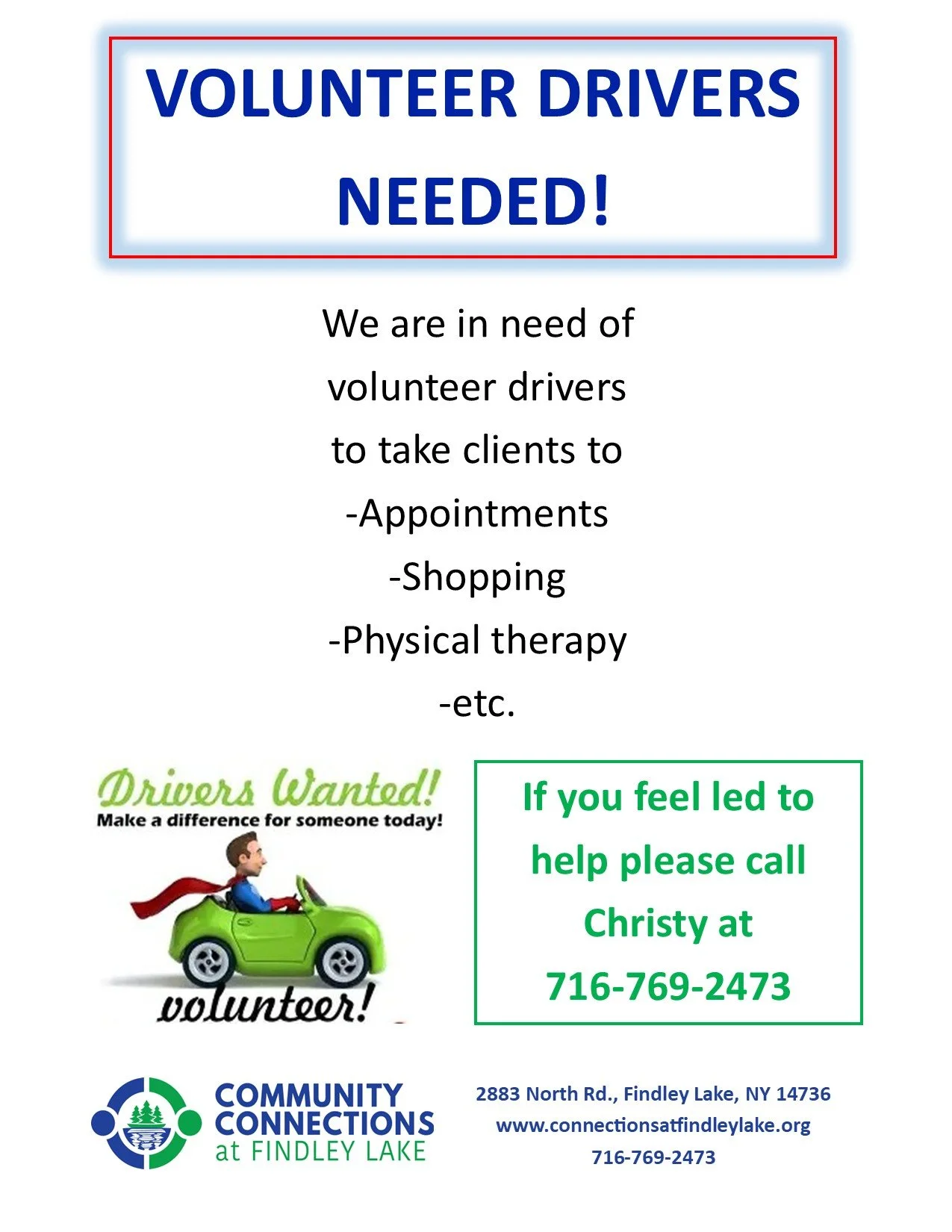We are in need of volunteer drivers to take clients to appointments, shopping, physical therapy, or other needs such as running errands for prescription or an order at a store pick up. If you are able to help, please call Christy at (716) 769-2473.